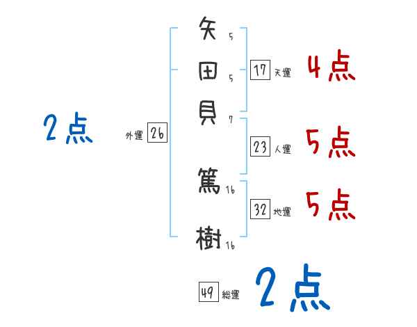 地運![]() | 矢田貝篤樹さんの地運は32画の5つ星!柔軟性があり成功する。チャンスが多く金運が良い。 個性を表す基礎的な運勢です。性格形成や対人関係、行動力など家庭環境に影響されます。主に誕生してから20歳くらいまでの若年期の運勢を表します。 |