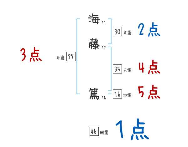 天運![]() | 海藤篤さんの天運は30画の2つ星!浮き沈みの激しさに注意しましょう。 家系が持つ宿命的な運勢を表します。祖先から受け継いだ苗字ですので自分の力が及びません。家柄を象徴します。 |