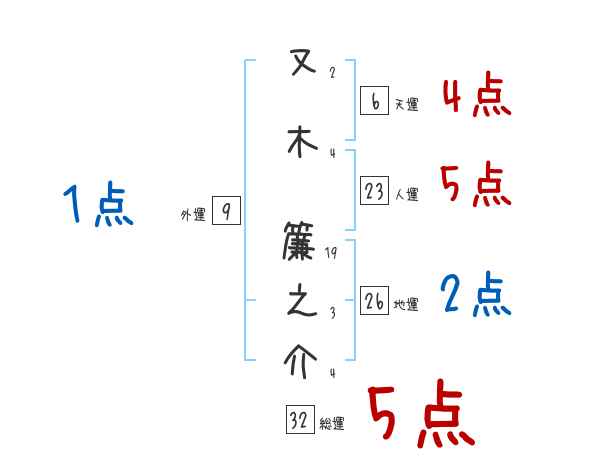 総運![]() | 又木簾之介さんの総運は32画の5つ星!柔軟性があり成功する。チャンスが多く金運が良い。 あなたの人生を表す1番重要な運勢です。生涯を通じて影響する総合運となり、主に50歳以降の晩年期に影響を及ぼします。 |