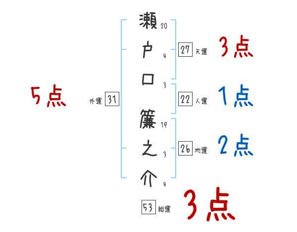 総運![]() | 瀬戸口簾之介さんの総運は53画の3つ星!やや見栄っ張りで虚栄心がある。散財に注意。 あなたの人生を表す1番重要な運勢です。生涯を通じて影響する総合運となり、主に50歳以降の晩年期に影響を及ぼします。 |