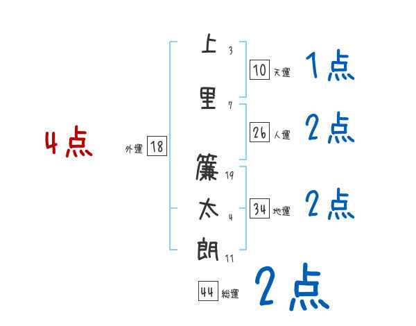 天運![]() | 上里簾太朗さんの天運は10画の1つ星!不安を感じやすい傾向。ストレスを抱えないように注意しましょう。 家系が持つ宿命的な運勢を表します。祖先から受け継いだ苗字ですので自分の力が及びません。家柄を象徴します。 |