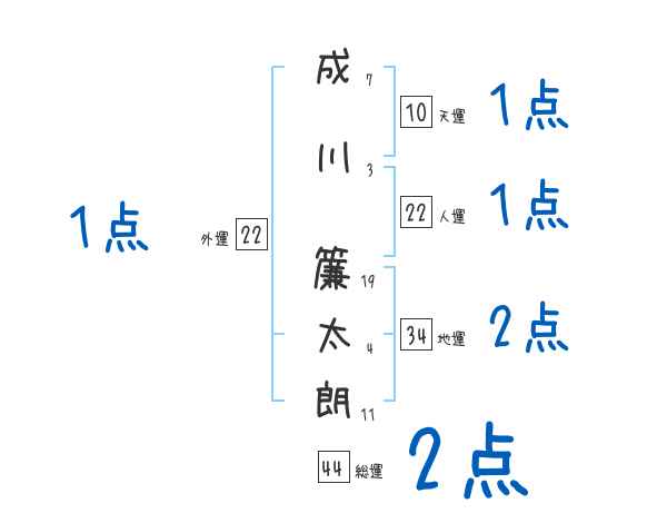 天運![]() | 成川簾太朗さんの天運は10画の1つ星!不安を感じやすい傾向。ストレスを抱えないように注意しましょう。 家系が持つ宿命的な運勢を表します。祖先から受け継いだ苗字ですので自分の力が及びません。家柄を象徴します。 |