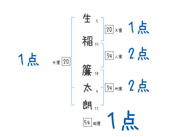 総運![]() | 生稲簾太朗さんの総運は54画の1つ星!トラブルが多いかも。周りをよく見て協調して過ごしましょう。 あなたの人生を表す1番重要な運勢です。生涯を通じて影響する総合運となり、主に50歳以降の晩年期に影響を及ぼします。 |