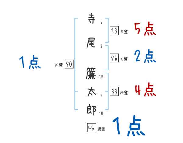 人運![]() | 寺尾簾太郎さんの人運は26画の2つ星!波瀾万丈かも。信頼できる人を大事にしましょう。 性格や才能などを表す2番目に重要な運勢です。人間関係や協調性、社会的な成功に影響します。主に20歳から50歳ぐらいまでの中年期の運勢を表します。 |