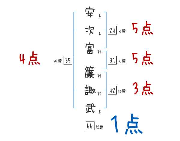 外運![]() | 安次富簾諏武さんの外運は35画の4つ星!温厚な性格で感受性が高い。穏和な性格で人望が厚い。 生活面を象徴する運勢です。外部から受ける影響力を表し、結婚運、家庭運や職場、環境への順応性を表します。 |