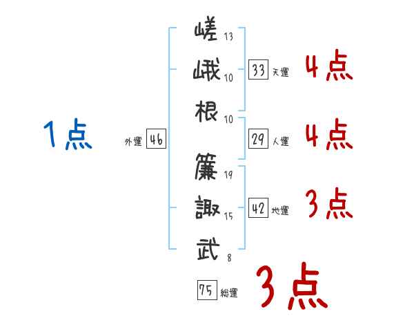 総運![]() | 嵯峨根簾諏武さんの総運は75画の3つ星!慎重な性格で保守的。 あなたの人生を表す1番重要な運勢です。生涯を通じて影響する総合運となり、主に50歳以降の晩年期に影響を及ぼします。 |