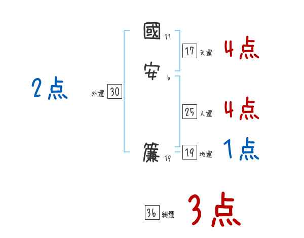 外運![]() | 國安簾さんの外運は30画の2つ星!浮き沈みの激しさに注意しましょう。 生活面を象徴する運勢です。外部から受ける影響力を表し、結婚運、家庭運や職場、環境への順応性を表します。 |