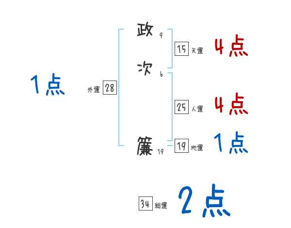 総運![]() | 政次簾さんの総運は34画の2つ星!独創性に優れるが、自尊心が強く災難に注意しましょう。 あなたの人生を表す1番重要な運勢です。生涯を通じて影響する総合運となり、主に50歳以降の晩年期に影響を及ぼします。 |