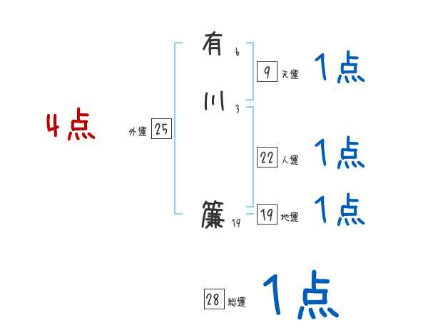総運![]() | 有川簾さんの総運は28画の1つ星!家庭環境に注意。スポーツで活躍できる能力があるかも。 あなたの人生を表す1番重要な運勢です。生涯を通じて影響する総合運となり、主に50歳以降の晩年期に影響を及ぼします。 |