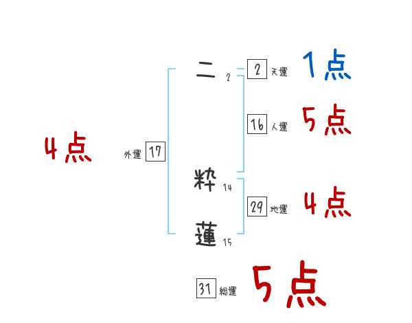 外運![]() | 二粋蓮さんの外運は17画の4つ星!積極的な行動力。地位を気づき財産を手に入れる。純粋な心と直感力。 生活面を象徴する運勢です。外部から受ける影響力を表し、結婚運、家庭運や職場、環境への順応性を表します。 |