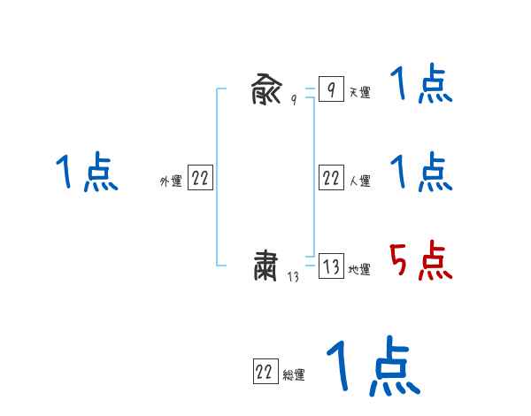 総運![]() | 兪粛さんの総運は22画の1つ星!努力することが苦手ないっぽう手先が器用。芸術性にも優れる。 あなたの人生を表す1番重要な運勢です。生涯を通じて影響する総合運となり、主に50歳以降の晩年期に影響を及ぼします。 |
