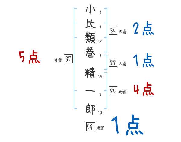 外運![]() | 小比類巻精一郎さんの外運は37画の5つ星!努力家で順応性に優れる。現実的な考え方ができ忠実に物事をこなす。 生活面を象徴する運勢です。外部から受ける影響力を表し、結婚運、家庭運や職場、環境への順応性を表します。 |