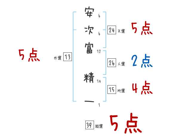 天運![]() | 安次富精一さんの天運は24画の5つ星!家庭運が良く順調な人生。金運にも恵まれる。 家系が持つ宿命的な運勢を表します。祖先から受け継いだ苗字ですので自分の力が及びません。家柄を象徴します。 |
