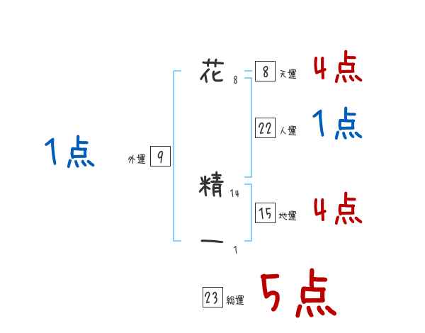 天運![]() | 花精一さんの天運は8画の4つ星!勤勉家。根気強く努力し成功する。忍耐力がある。 家系が持つ宿命的な運勢を表します。祖先から受け継いだ苗字ですので自分の力が及びません。家柄を象徴します。 |