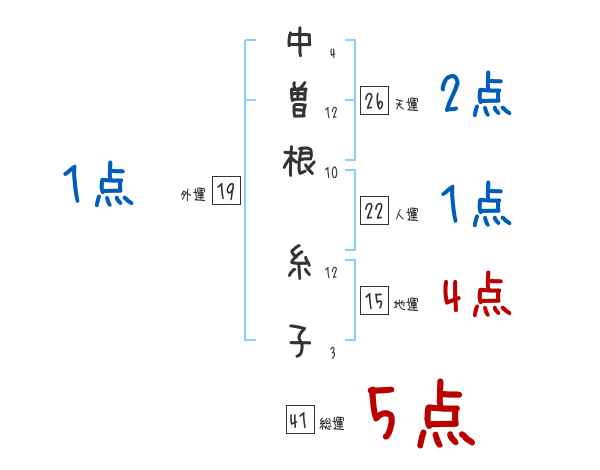 天運![]() | 中曽根糸子さんの天運は26画の2つ星!波瀾万丈かも。信頼できる人を大事にしましょう。 家系が持つ宿命的な運勢を表します。祖先から受け継いだ苗字ですので自分の力が及びません。家柄を象徴します。 |