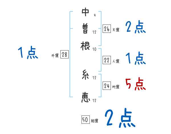 外運![]() | 中曽根糸恵さんの外運は28画の1つ星!家庭環境に注意。スポーツで活躍できる能力があるかも。 生活面を象徴する運勢です。外部から受ける影響力を表し、結婚運、家庭運や職場、環境への順応性を表します。 |