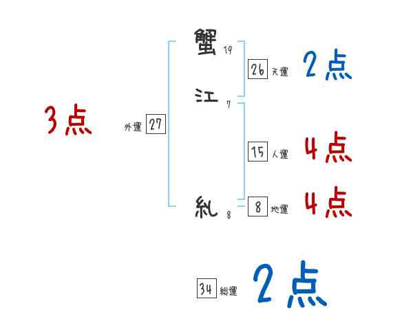 総運![]() | 蟹江糺さんの総運は34画の2つ星!独創性に優れるが、自尊心が強く災難に注意しましょう。 あなたの人生を表す1番重要な運勢です。生涯を通じて影響する総合運となり、主に50歳以降の晩年期に影響を及ぼします。 |
