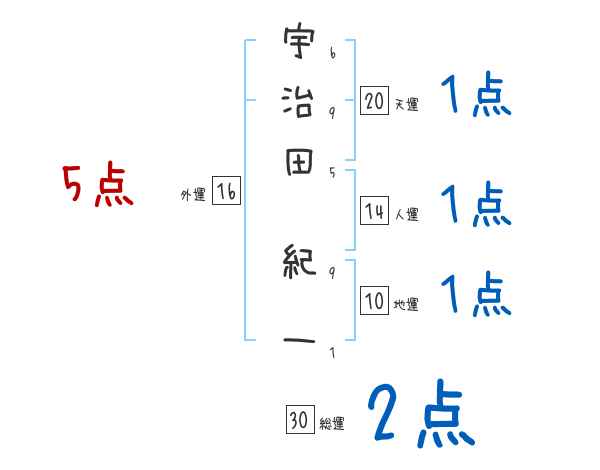 外運![]() | 宇治田紀一さんの外運は16画の5つ星!人望が厚く大きく発展する。逆転成功が見える。 生活面を象徴する運勢です。外部から受ける影響力を表し、結婚運、家庭運や職場、環境への順応性を表します。 |