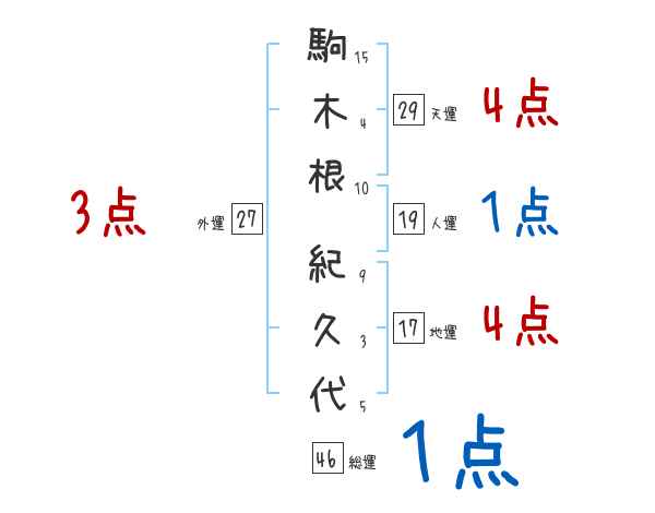天運![]() | 駒木根紀久代さんの天運は29画の4つ星!完全主義で才能がある。厳格な心の持ち主。 家系が持つ宿命的な運勢を表します。祖先から受け継いだ苗字ですので自分の力が及びません。家柄を象徴します。 |
