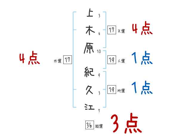 外運![]() | 上木原紀久江さんの外運は17画の4つ星!積極的な行動力。地位を気づき財産を手に入れる。純粋な心と直感力。 生活面を象徴する運勢です。外部から受ける影響力を表し、結婚運、家庭運や職場、環境への順応性を表します。 |