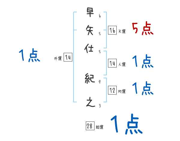 総運![]() | 早矢仕紀之さんの総運は28画の1つ星!家庭環境に注意。スポーツで活躍できる能力があるかも。 あなたの人生を表す1番重要な運勢です。生涯を通じて影響する総合運となり、主に50歳以降の晩年期に影響を及ぼします。 |