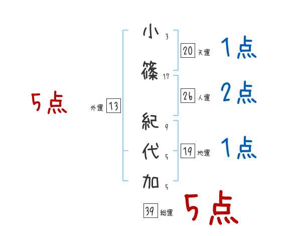 外運![]() | 小篠紀代加さんの外運は13画の5つ星!才能に恵まれ人気がある。名声を手に入れる。円満な人生。 生活面を象徴する運勢です。外部から受ける影響力を表し、結婚運、家庭運や職場、環境への順応性を表します。 |