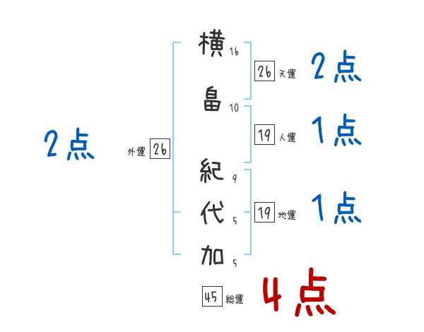 外運![]() | 横畠紀代加さんの外運は26画の2つ星!波瀾万丈かも。信頼できる人を大事にしましょう。 生活面を象徴する運勢です。外部から受ける影響力を表し、結婚運、家庭運や職場、環境への順応性を表します。 |