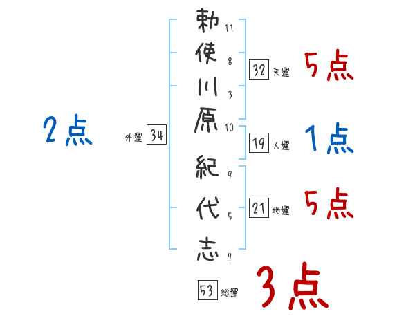 天運![]() | 勅使川原紀代志さんの天運は32画の5つ星!柔軟性があり成功する。チャンスが多く金運が良い。 家系が持つ宿命的な運勢を表します。祖先から受け継いだ苗字ですので自分の力が及びません。家柄を象徴します。 |