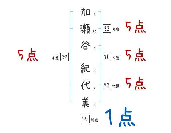 天運![]() | 加瀬谷紀代美さんの天運は32画の5つ星!柔軟性があり成功する。チャンスが多く金運が良い。 家系が持つ宿命的な運勢を表します。祖先から受け継いだ苗字ですので自分の力が及びません。家柄を象徴します。 |
