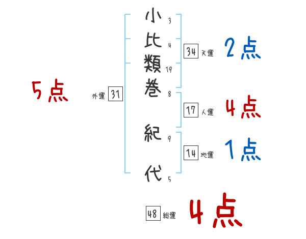 天運![]() | 小比類巻紀代さんの天運は34画の2つ星!独創性に優れるが、自尊心が強く災難に注意しましょう。 家系が持つ宿命的な運勢を表します。祖先から受け継いだ苗字ですので自分の力が及びません。家柄を象徴します。 |