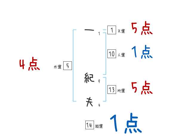 天運![]() | 一紀夫さんの天運は1画の5つ星!行動力、指導力があり出世し繁栄する。幸運に恵まれる。 家系が持つ宿命的な運勢を表します。祖先から受け継いだ苗字ですので自分の力が及びません。家柄を象徴します。 |