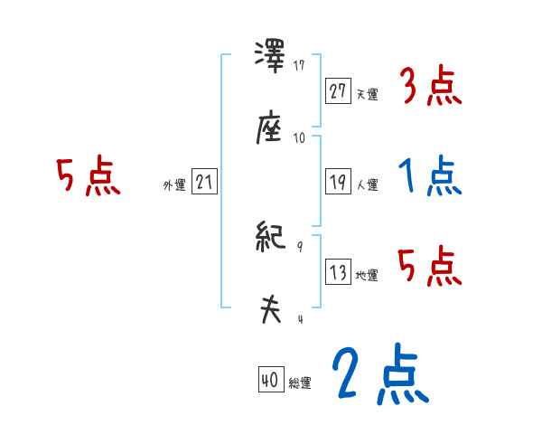 天運![]() | 澤座紀夫さんの天運は27画の3つ星!頭脳明晰だが強情で摩擦が多い傾向。孤立に注意。 家系が持つ宿命的な運勢を表します。祖先から受け継いだ苗字ですので自分の力が及びません。家柄を象徴します。 |
