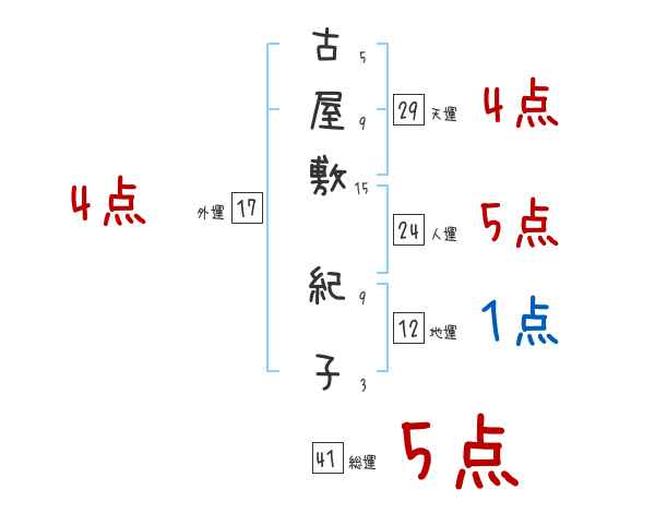 外運![]() | 古屋敷紀子さんの外運は17画の4つ星!積極的な行動力。地位を気づき財産を手に入れる。純粋な心と直感力。 生活面を象徴する運勢です。外部から受ける影響力を表し、結婚運、家庭運や職場、環境への順応性を表します。 |