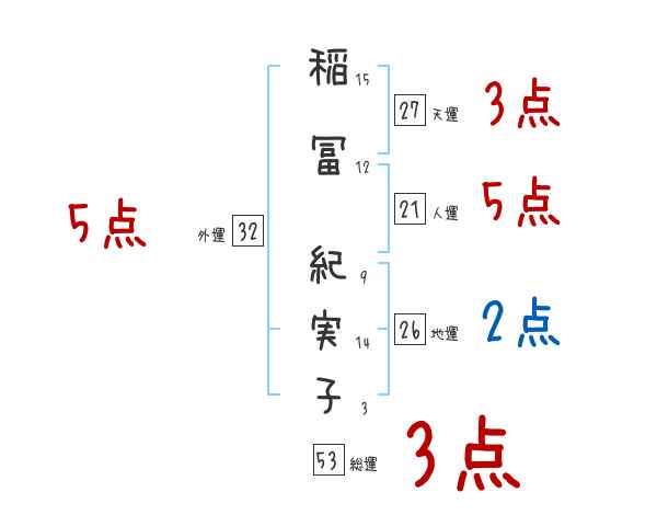 外運![]() | 稲冨紀実子さんの外運は32画の5つ星!柔軟性があり成功する。チャンスが多く金運が良い。 生活面を象徴する運勢です。外部から受ける影響力を表し、結婚運、家庭運や職場、環境への順応性を表します。 |