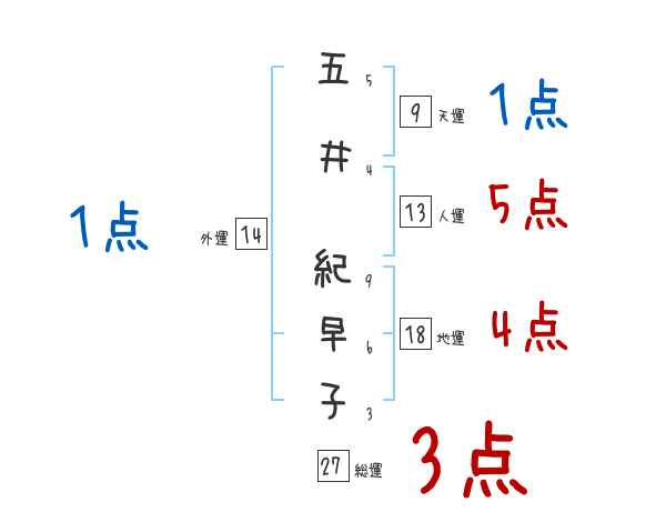 外運![]() | 五井紀早子さんの外運は14画の1つ星!人に対して優しいがストレスを溜め込みがち。人間関係のトラブルを避けるよう気をつけましょう。 生活面を象徴する運勢です。外部から受ける影響力を表し、結婚運、家庭運や職場、環境への順応性を表します。 |