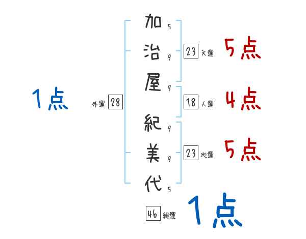 天運![]() | 加治屋紀美代さんの天運は23画の5つ星!想像力に優れ活力がある。一代で成功し名誉を手に入れる。 家系が持つ宿命的な運勢を表します。祖先から受け継いだ苗字ですので自分の力が及びません。家柄を象徴します。 |