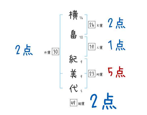 外運![]() | 横畠紀美代さんの外運は30画の2つ星!浮き沈みの激しさに注意しましょう。 生活面を象徴する運勢です。外部から受ける影響力を表し、結婚運、家庭運や職場、環境への順応性を表します。 |