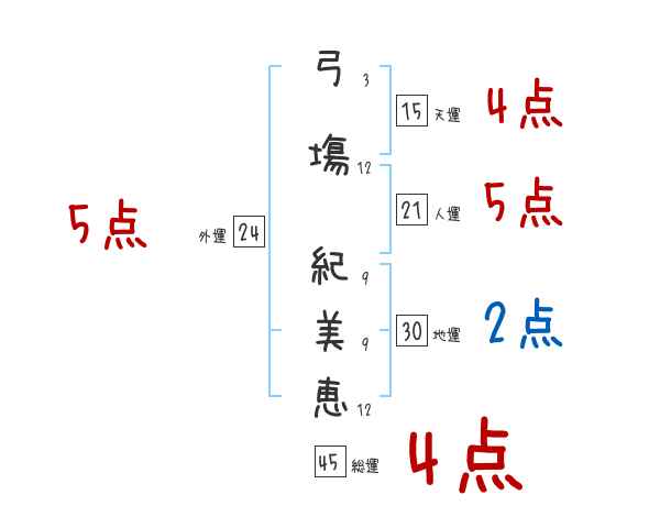 外運![]() | 弓塲紀美恵さんの外運は24画の5つ星!家庭運が良く順調な人生。金運にも恵まれる。 生活面を象徴する運勢です。外部から受ける影響力を表し、結婚運、家庭運や職場、環境への順応性を表します。 |
