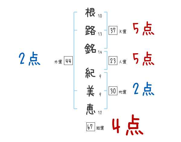 人運![]() | 根路銘紀美恵さんの人運は23画の5つ星!想像力に優れ活力がある。一代で成功し名誉を手に入れる。 性格や才能などを表す2番目に重要な運勢です。人間関係や協調性、社会的な成功に影響します。主に20歳から50歳ぐらいまでの中年期の運勢を表します。 |