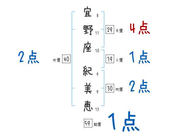 天運![]() | 宜野座紀美恵さんの天運は29画の4つ星!完全主義で才能がある。厳格な心の持ち主。 家系が持つ宿命的な運勢を表します。祖先から受け継いだ苗字ですので自分の力が及びません。家柄を象徴します。 |