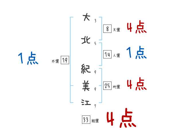 | 天運  | 大北紀美江さんの天運は8画の4つ星!勤勉家。根気強く努力し成功する。忍耐力がある。家系が持つ宿命的な運勢を表します。祖先から受け継いだ苗字ですので自分の力が及びません。家柄を象徴します。 |