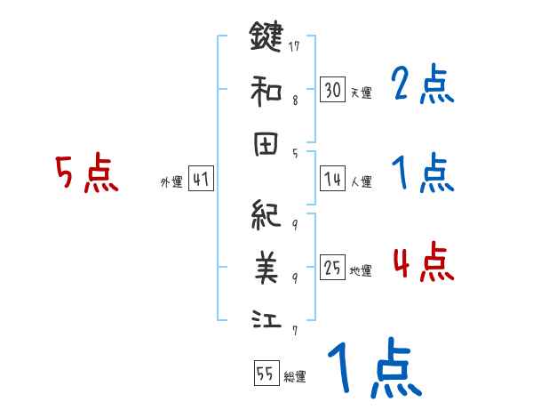 天運![]() | 鍵和田紀美江さんの天運は30画の2つ星!浮き沈みの激しさに注意しましょう。 家系が持つ宿命的な運勢を表します。祖先から受け継いだ苗字ですので自分の力が及びません。家柄を象徴します。 |
