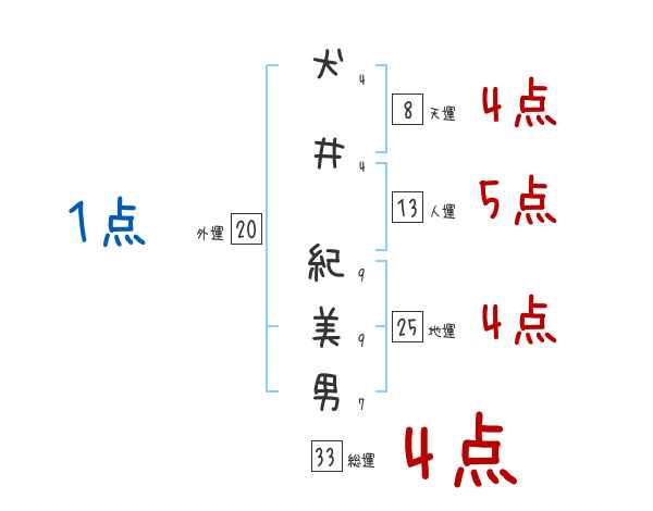 天運![]() | 犬井紀美男さんの天運は8画の4つ星!勤勉家。根気強く努力し成功する。忍耐力がある。 家系が持つ宿命的な運勢を表します。祖先から受け継いだ苗字ですので自分の力が及びません。家柄を象徴します。 |