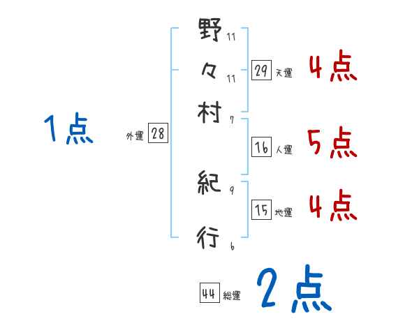 天運![]() | 野々村紀行さんの天運は29画の4つ星!完全主義で才能がある。厳格な心の持ち主。 家系が持つ宿命的な運勢を表します。祖先から受け継いだ苗字ですので自分の力が及びません。家柄を象徴します。 |
