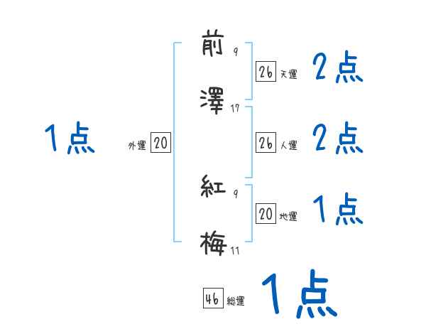 総運![]() | 前澤紅梅さんの総運は46画の1つ星!迷走することが多く苦労するかも。目先のことにとらわれないように。 あなたの人生を表す1番重要な運勢です。生涯を通じて影響する総合運となり、主に50歳以降の晩年期に影響を及ぼします。 |