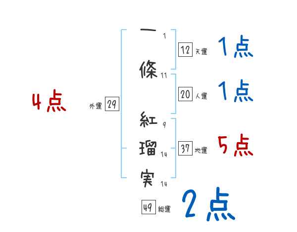 外運![]() | 一條紅瑠実さんの外運は29画の4つ星!完全主義で才能がある。厳格な心の持ち主。 生活面を象徴する運勢です。外部から受ける影響力を表し、結婚運、家庭運や職場、環境への順応性を表します。 |