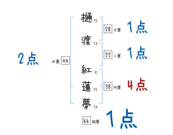 外運![]() | 樋渡紅蓮夢さんの外運は44画の2つ星!誠実で慎重な性格。物事を考えすぎないように注意しましょう。 生活面を象徴する運勢です。外部から受ける影響力を表し、結婚運、家庭運や職場、環境への順応性を表します。 |