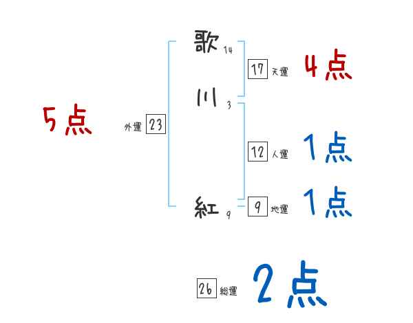 総運![]() | 歌川紅さんの総運は26画の2つ星!波瀾万丈かも。信頼できる人を大事にしましょう。 あなたの人生を表す1番重要な運勢です。生涯を通じて影響する総合運となり、主に50歳以降の晩年期に影響を及ぼします。 |