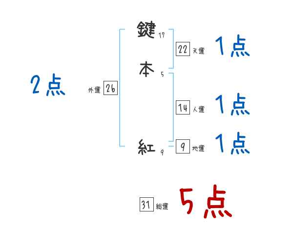天運![]() | 鍵本紅さんの天運は22画の1つ星!努力することが苦手ないっぽう手先が器用。芸術性にも優れる。 家系が持つ宿命的な運勢を表します。祖先から受け継いだ苗字ですので自分の力が及びません。家柄を象徴します。 |