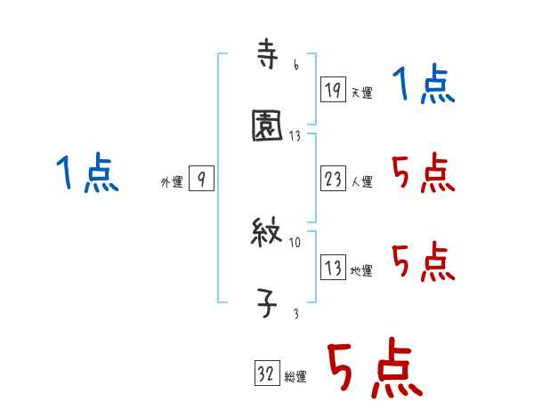 総運![]() | 寺園紋子さんの総運は32画の5つ星!柔軟性があり成功する。チャンスが多く金運が良い。 あなたの人生を表す1番重要な運勢です。生涯を通じて影響する総合運となり、主に50歳以降の晩年期に影響を及ぼします。 |